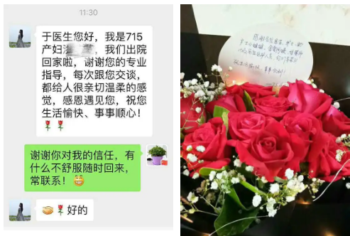感恩这位宝妈和家属的认可、点赞,在出院之际,给我们的医生发了点赞微信,还为医护人员送来鲜花!